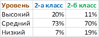 1. По результатам диагностики «Исключение лишнего» можно сделать вывод о том, что уровень сформированности логических УУД во 2-а классе находится выше, чем во 2-б классе. В целом уровень сформированности находится на среднем уровне. Для сравнения полученных данных используем сводную таблицу и диаграмму.
